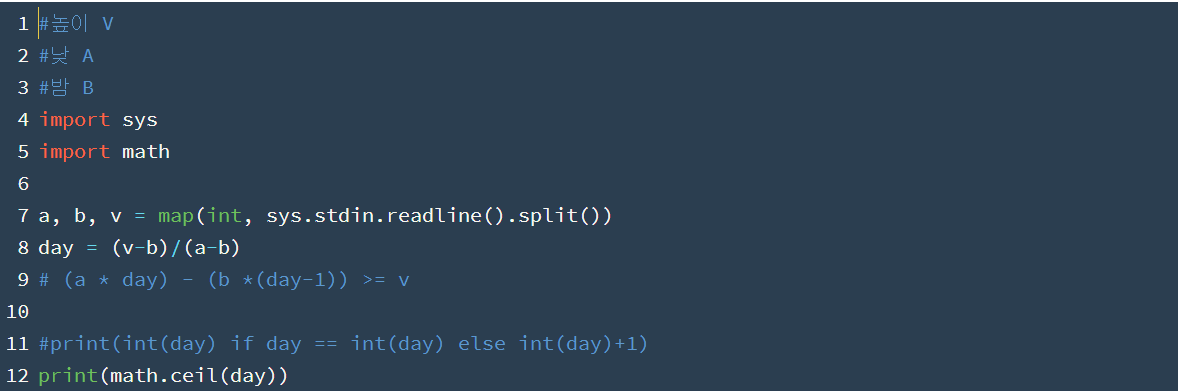 ==> 공식을 계산하면 "소요일 >= (높이 - 밤) / (낮 - 밤) 에서 소수점이 나오면 올림해야 함.