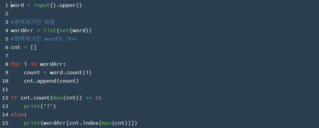 첫째 줄에 이 단어에서 가장 많이 사용된 알파벳을 대문자로 출력한다.